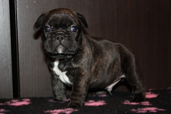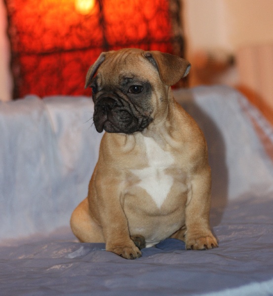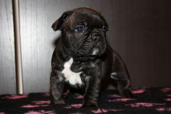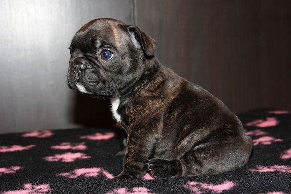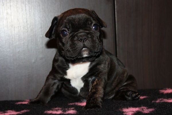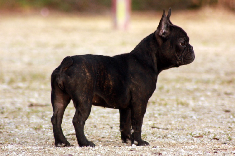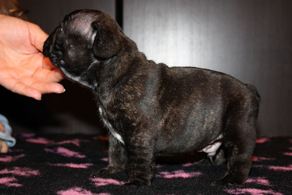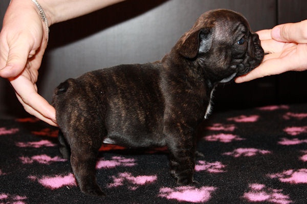 Superbe mâle bringé avec plastron blanc, porteur de la panachure. Caractère très joyeux. Excellent type en tête, corps court, belle queue droite. Les 2 testicules sont en place. Pour expo et/ou compagnie.