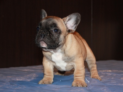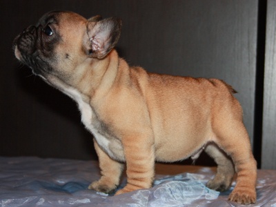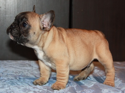 Superbe mâle fauve avec plastron blanc, porteur de la panachure. Excellent type en tête, corps court, belle queue droite. Le masque est moins clair que sur les photos et ses oreilles sont maintenant levées. Les 2 testicules sont en place. Pour expo et/ou compagnie.