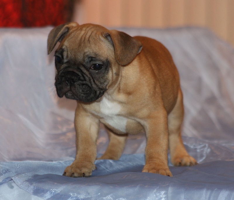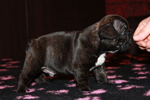 Magnifique mâle bringé avec plastron, porteur de la panachure. Excellent type en tête. La tête est bien large ainsi que la machoire, le corps est court, queue en virgule. Pour expo et/ou compagnie.